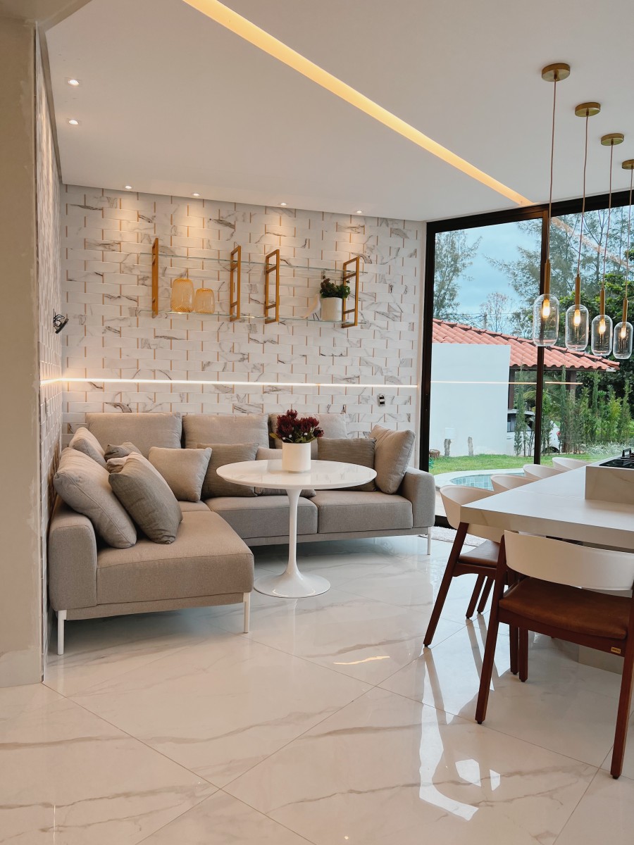 Os espaços internos se organizam de maneira fluida, com áreas sociais integradas que se expandem para o deck e a piscina. A materialidade combina madeira, pedra e superfícies claras, equilibrando calor, sobriedade e amplitude. A Casa Alvor traduz o morar como experiência silenciosa, onde arquitetura, luz e cotidiano coexistem em harmonia.