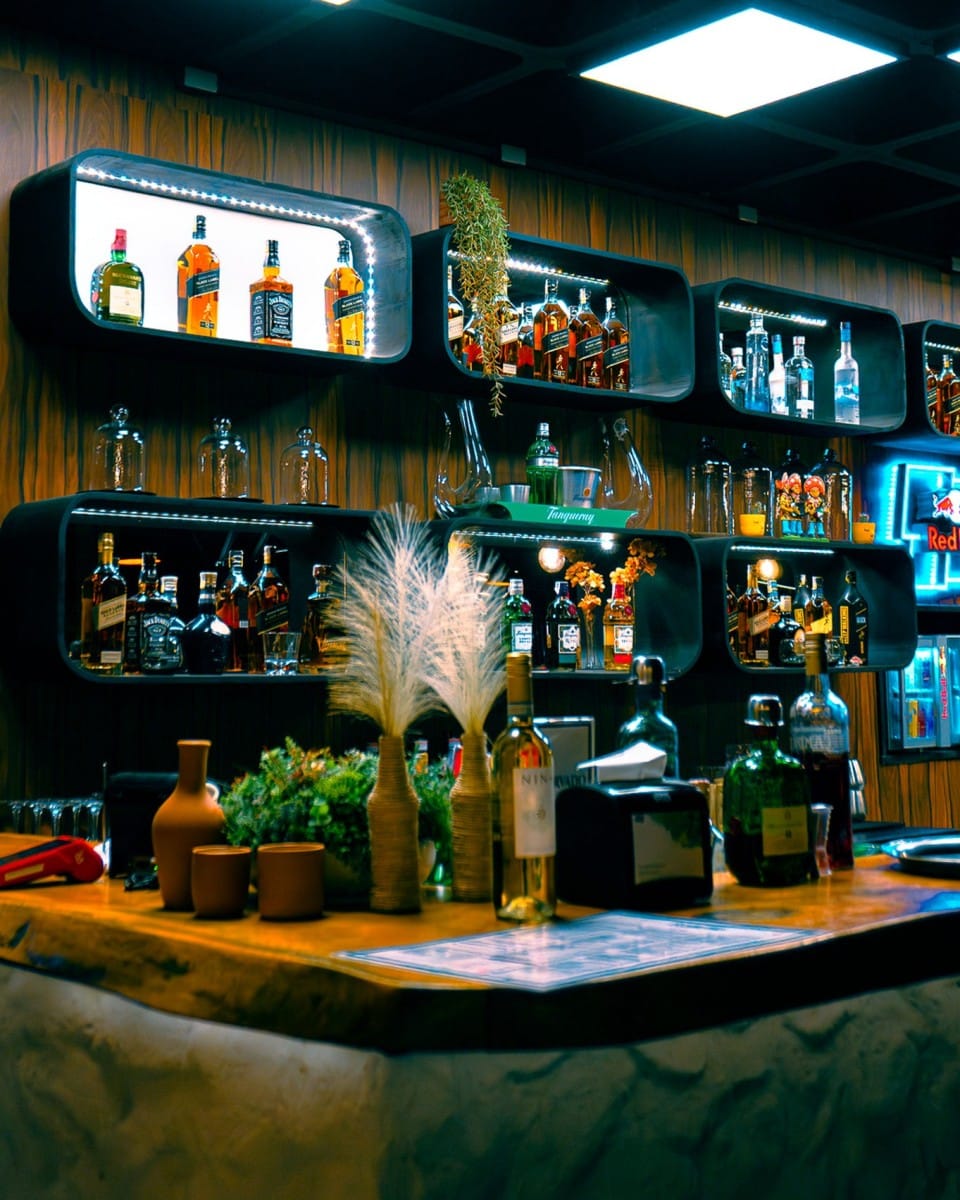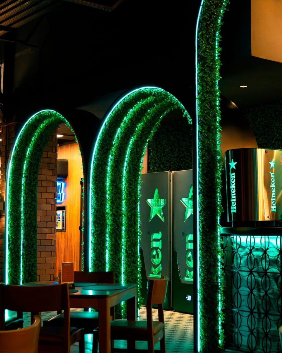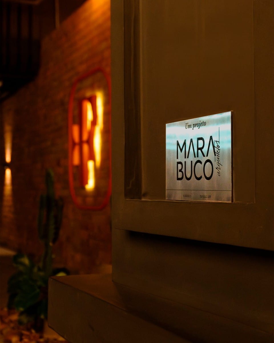 A iluminação é outro destaque do projeto, com luzes indiretas e projeções de luzes urbanas, criando uma atmosfera intimista e moderna, ideal para a experiência gastronômica no rooftop. Além disso, o design do bar e da parrilla foi pensado para ser um atrativo visual, integrando-se à proposta geral e oferecendo um ambiente gastronômico que combina perfeitamente com a estética do local.