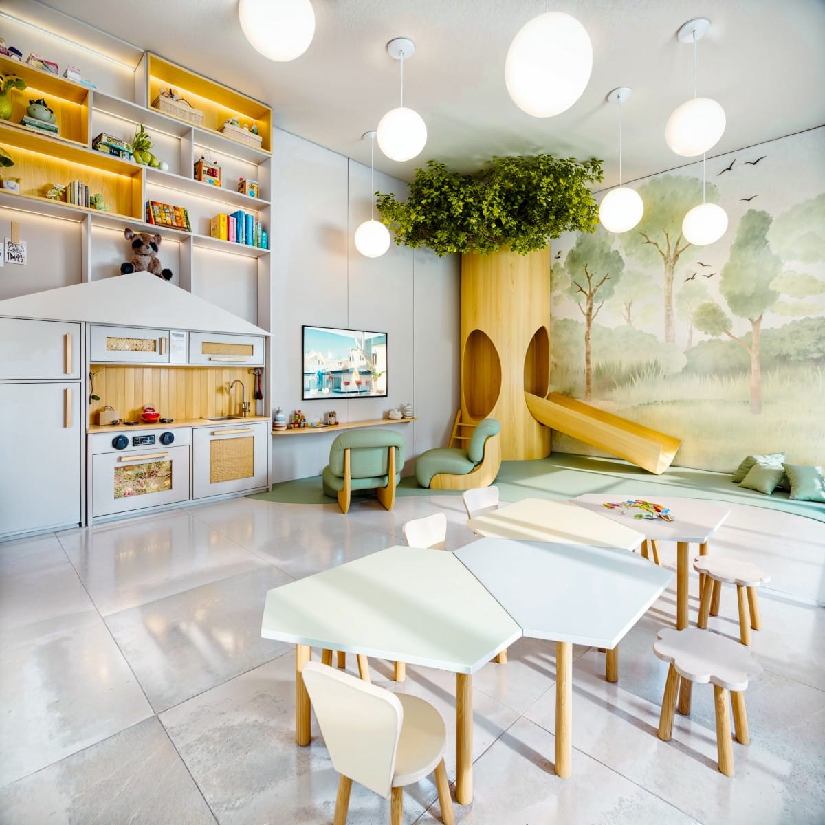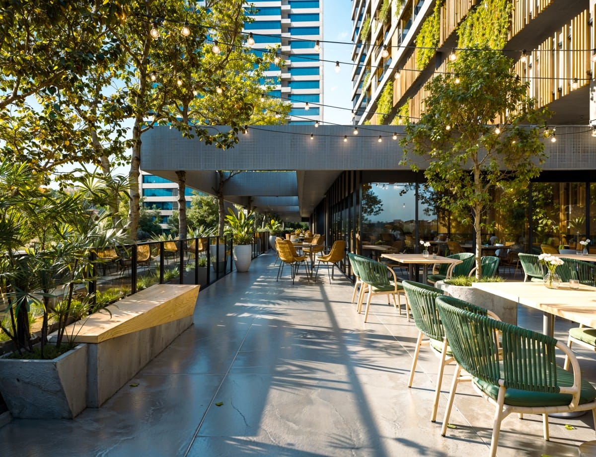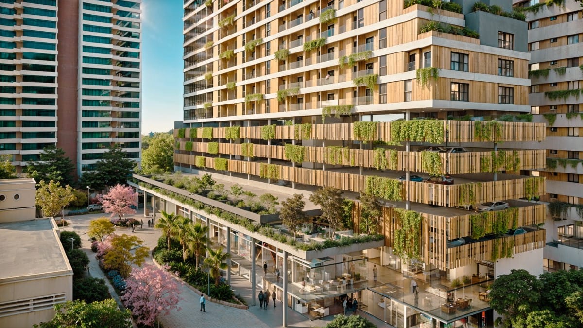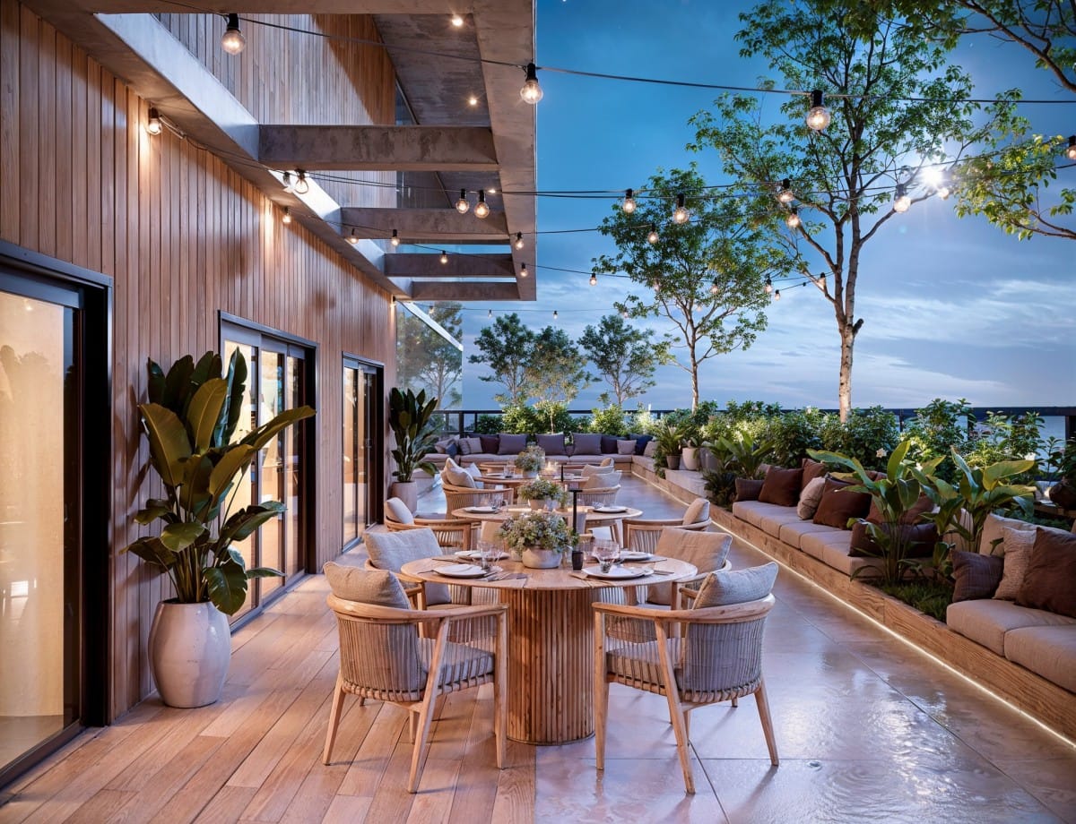 A vegetação não é apenas um complemento, mas parte integrante da composição. Espaços verdes estrategicamente distribuídos criam áreas de convívio que fluem naturalmente entre os andares, enquanto o design biomórfico confere leveza e movimento à estrutura. O resultado é uma arquitetura que respira junto com seu entorno, diluindo os limites entre o urbano e o orgânico.
