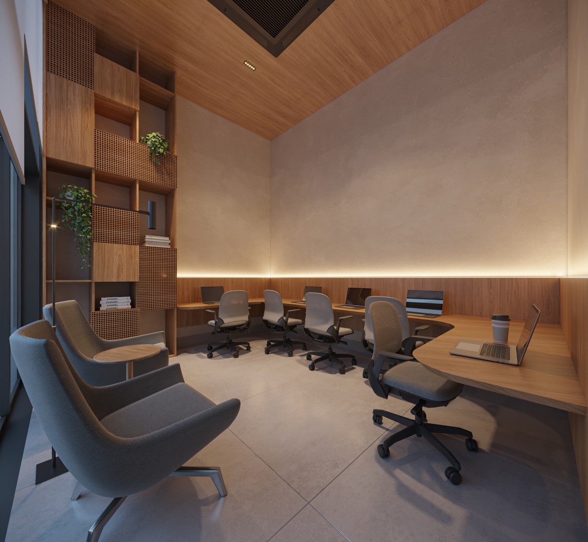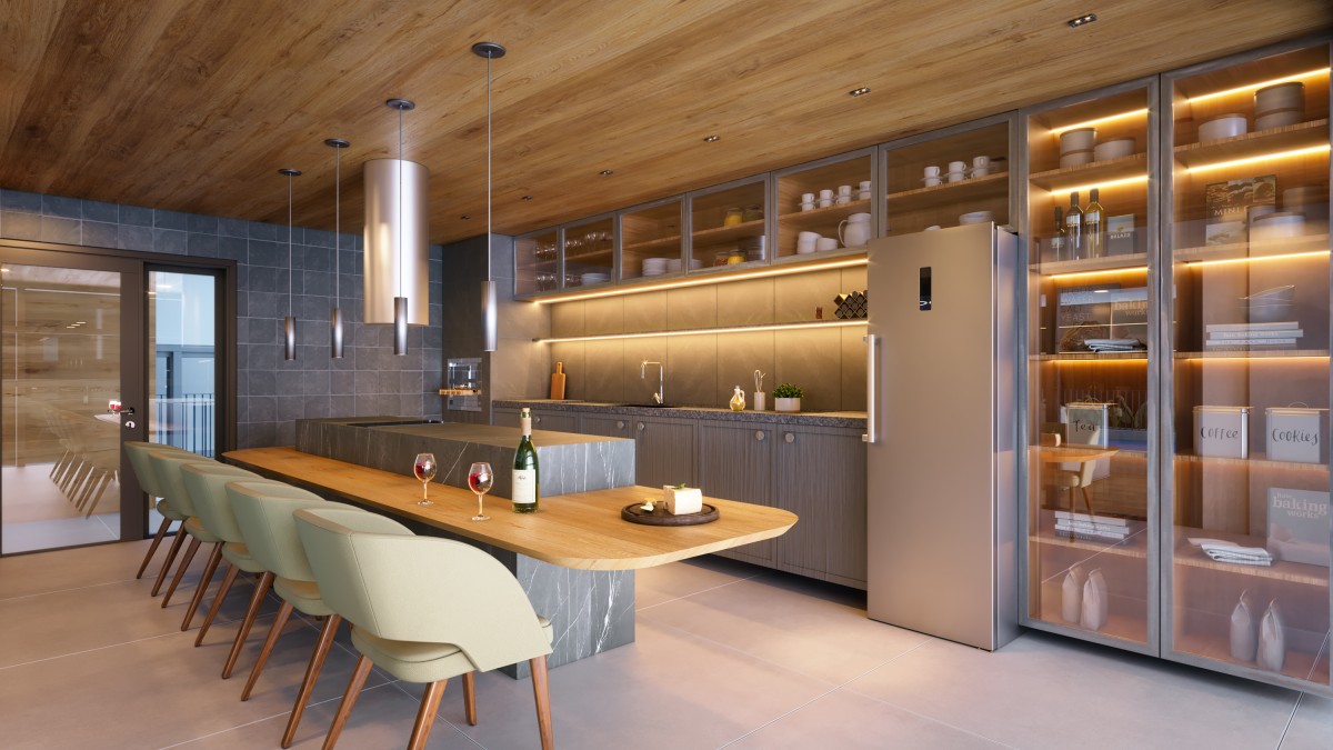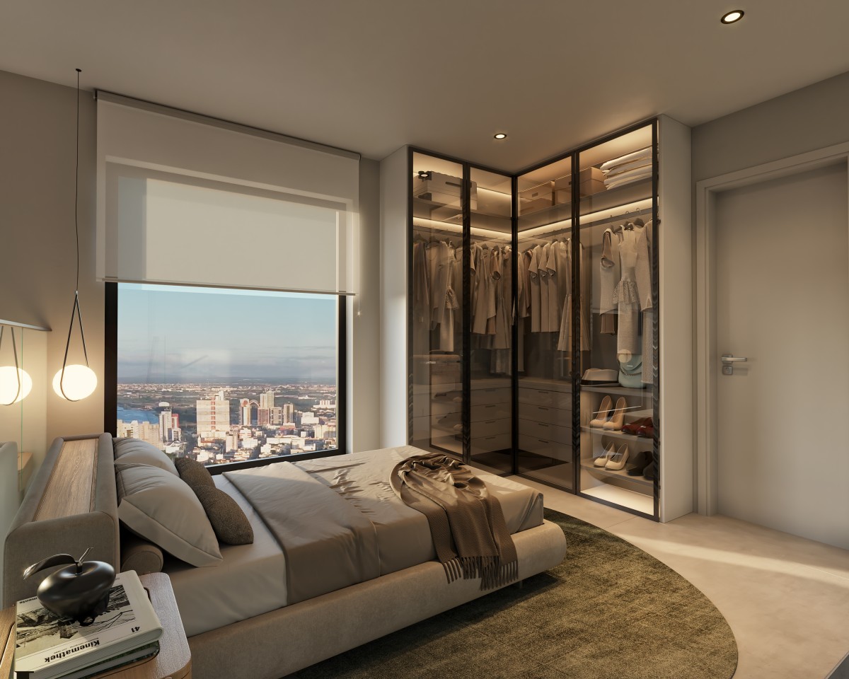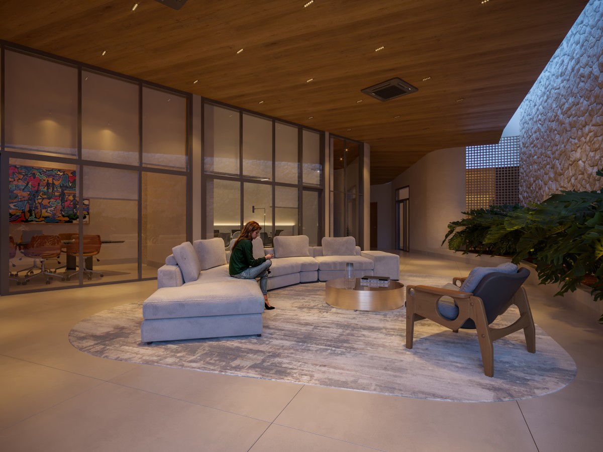 No térreo, a base permeável se transforma em ambiente vivo, onde usos comerciais e áreas de convivência dialogam com a calçada e ativam o espaço público. O desenho interior valoriza fluidez, continuidade visual e integração, permitindo que o movimento da cidade atravesse o edifício de maneira natural.